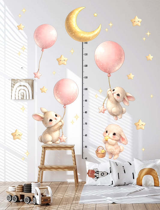 Pembe Balonlu Tavşanlar – Ay Işığında Büyüme Yolculuğu | Boy Ölçer Çocuk Odası Duvar Sticker