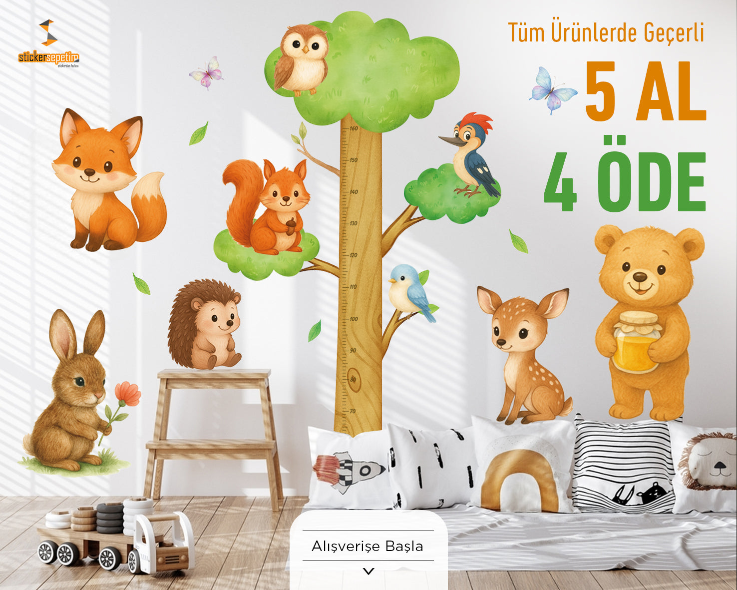 Sevimli Hayvanlar Temalı Boy Ölçer Çok Amaçlı Çocuk Odası Duvar Sticker Seti