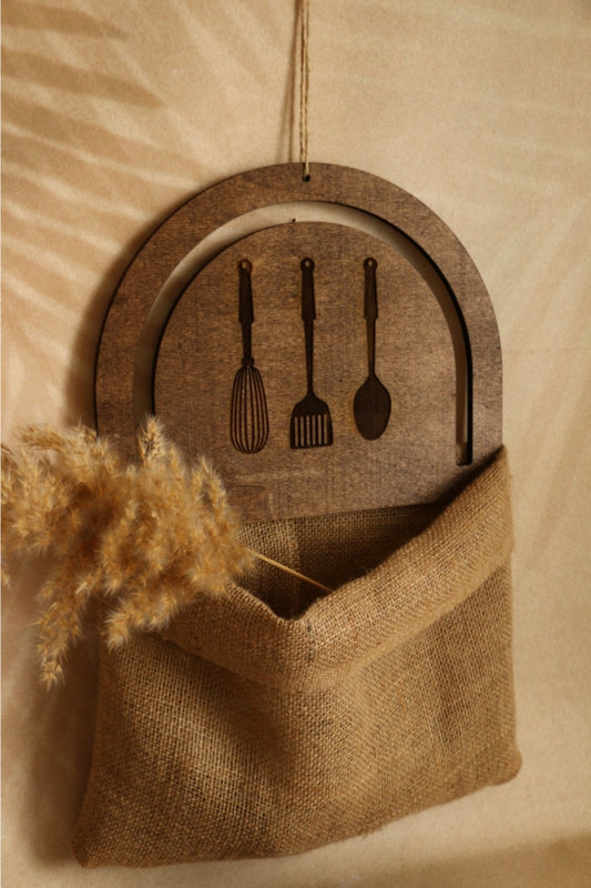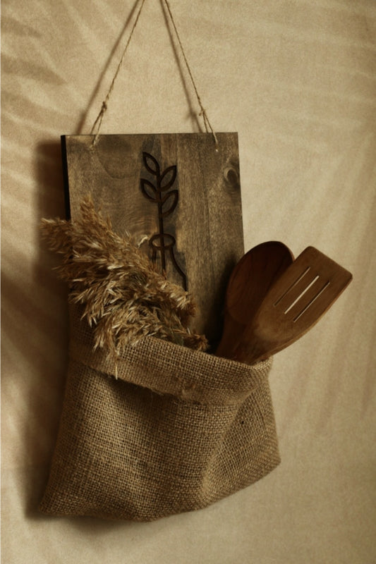 Hoyatap El Yapımı Oyma Desenli Ahşap Çuval ve Çiçek Temalı Organizer - Mutfak Dekoru