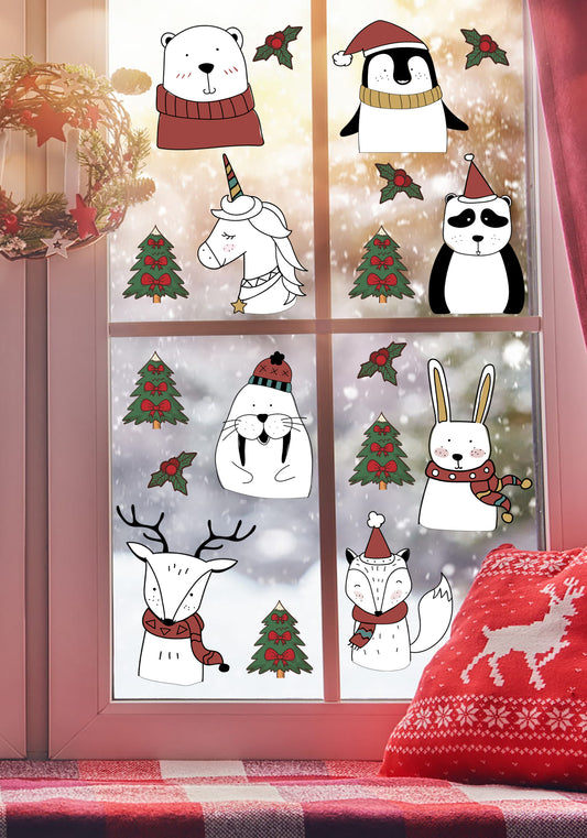 Kış Temalı Sevimli Hayvanlar Çam Ağacı Christmas Cam, Duvar Sticker Seti