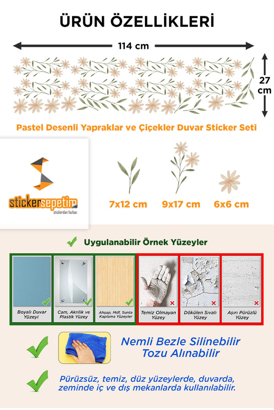 Pastel Desenli Yapraklar ve Çiçekler Duvar Sticker Seti