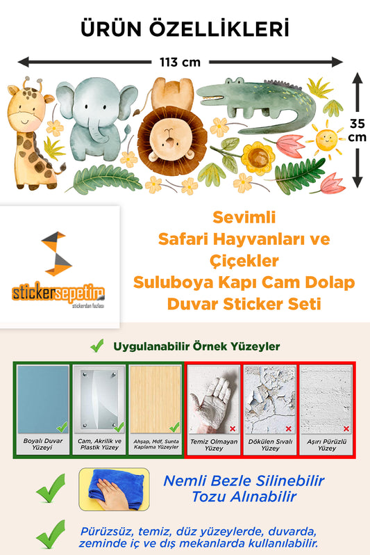 Sevimli Safari Hayvanları ve Çiçekler Suluboya Kapı Cam Dolap Duvar Sticker Seti
