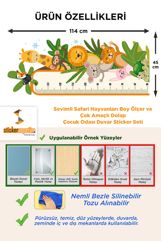 Sevimli Safari Hayvanları Boy Ölçer ve Çok Amaçlı Dolap Çocuk Odası Duvar Sticker Seti