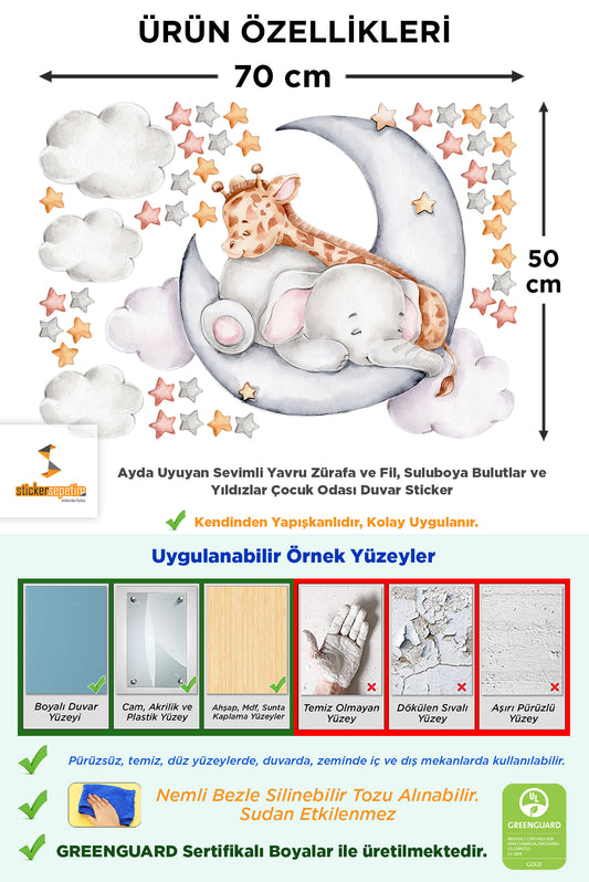 Sevimli Yavru Zürafa Ve Fil Suluboya Bulut Ve Yıldızlar Çocuk Odası Dekoratif Duvar Sticker