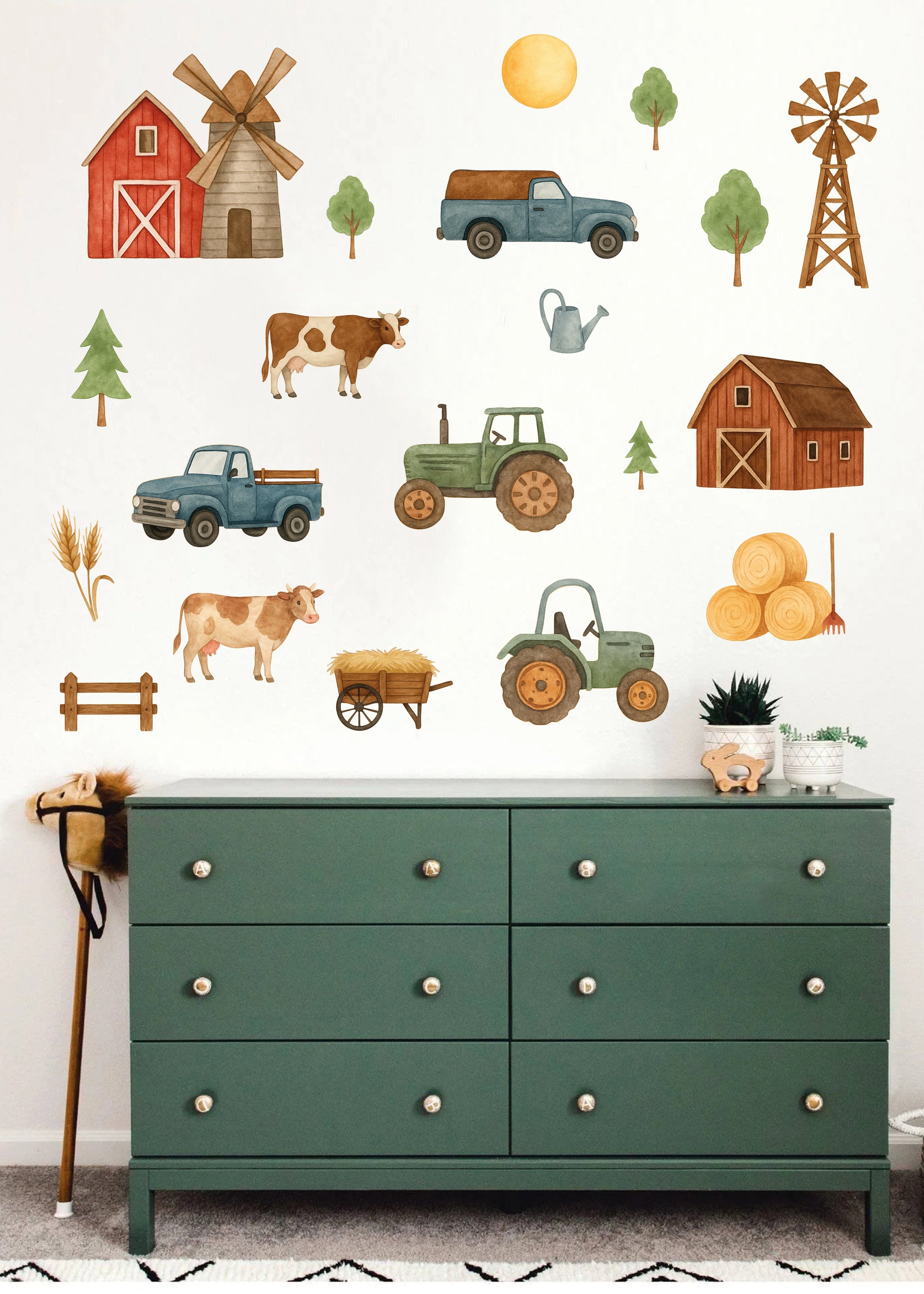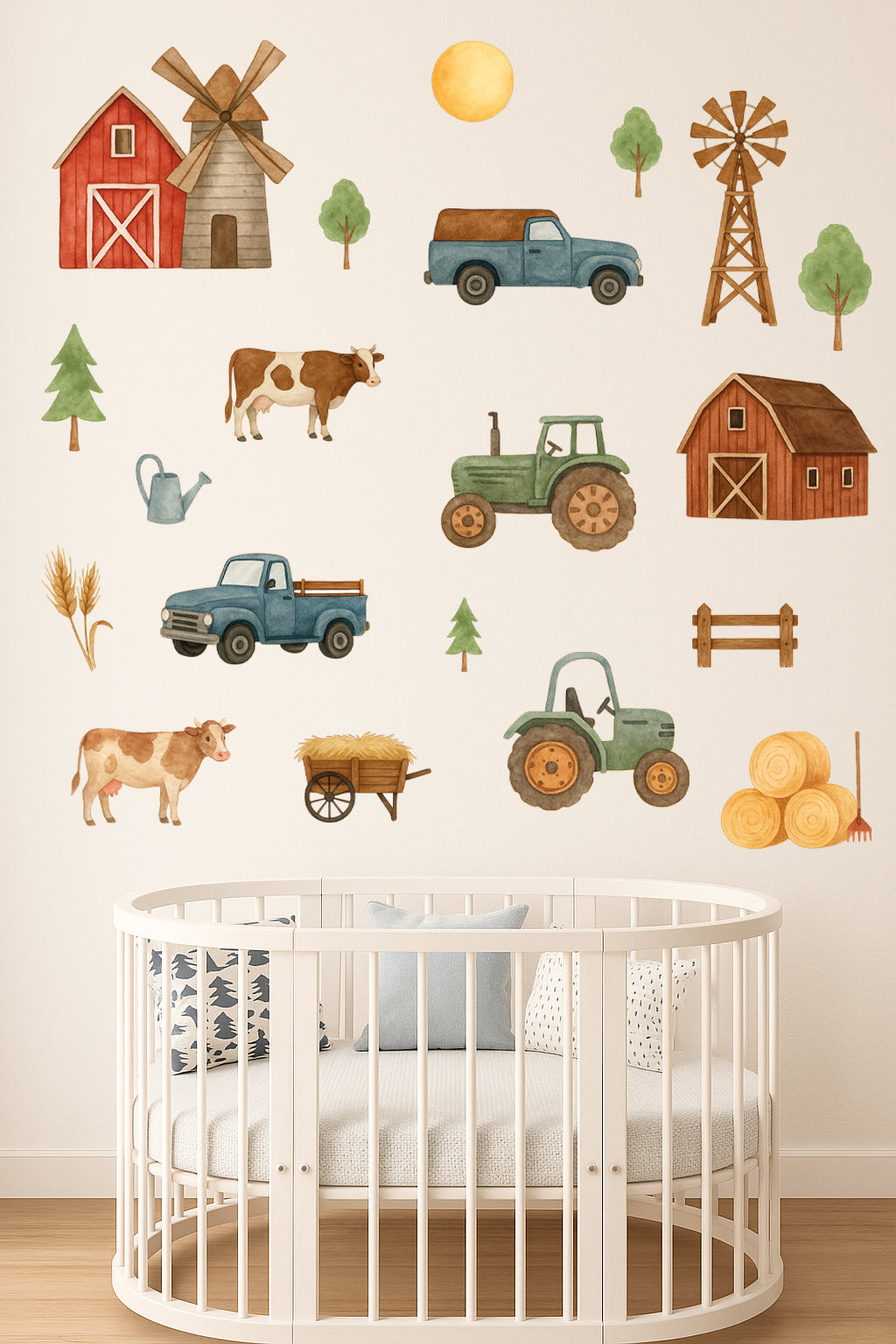 Çocuk odalarına doğal, sıcak ve eğlenceli bir atmosfer kazandıran çiftlik temalı duvar sticker seti, traktörler, kamyonlar, ahırlar, hayvanlar ve çiftlik objeleri ile miniklerin hayal dünyasını zenginleştirir. Soft renkleri ve suluboya tarzı tasarımı sayesinde hem modern hem de sade bir görünüm sunar.
