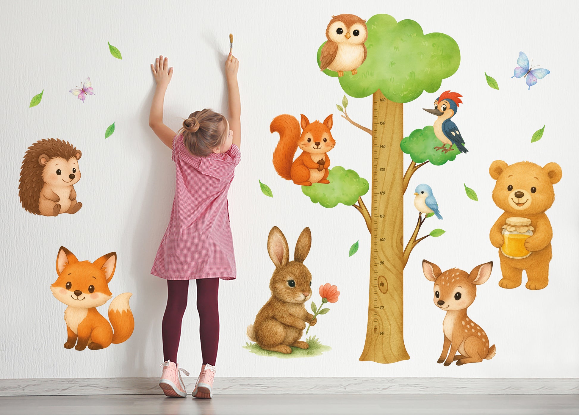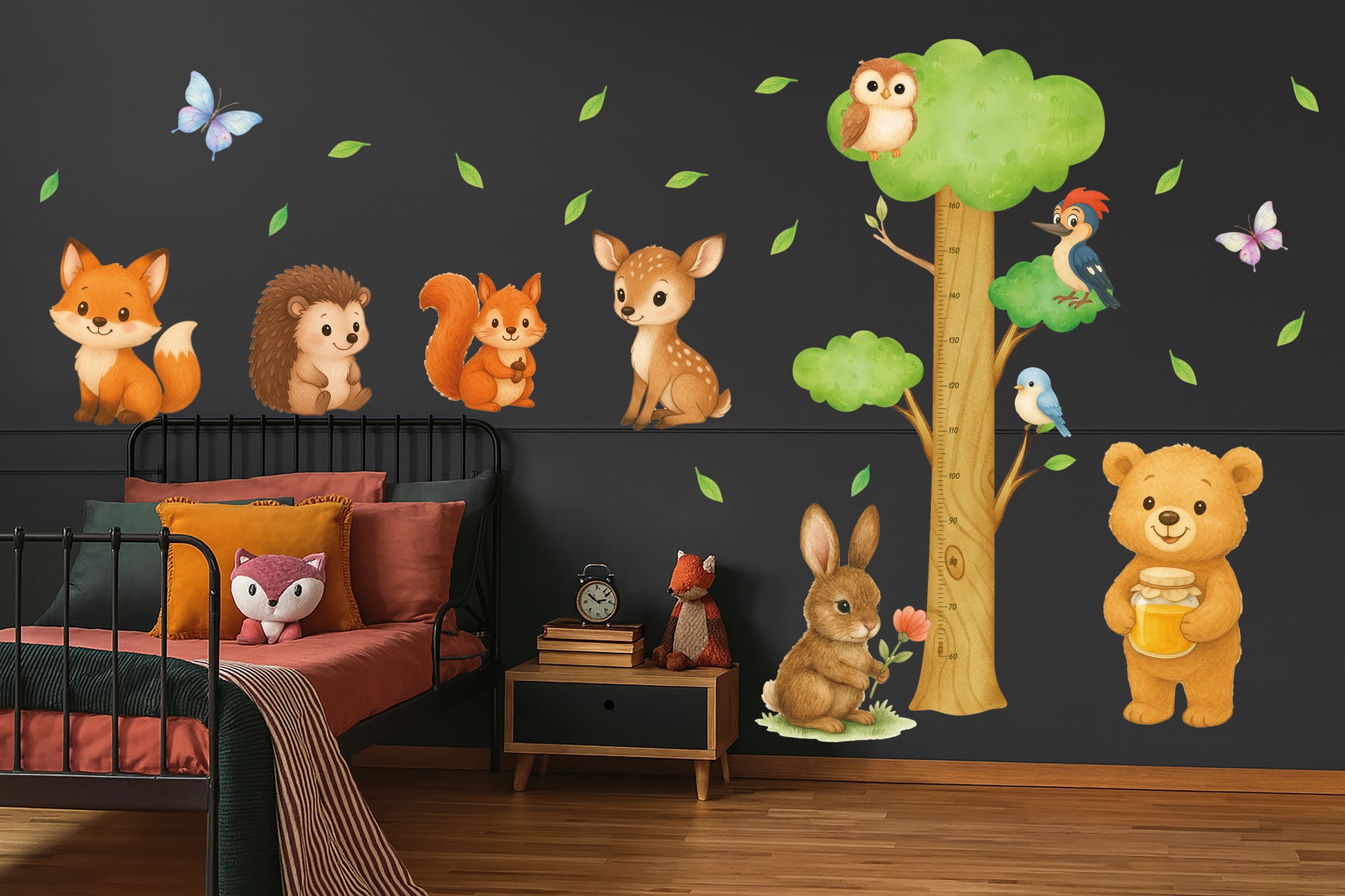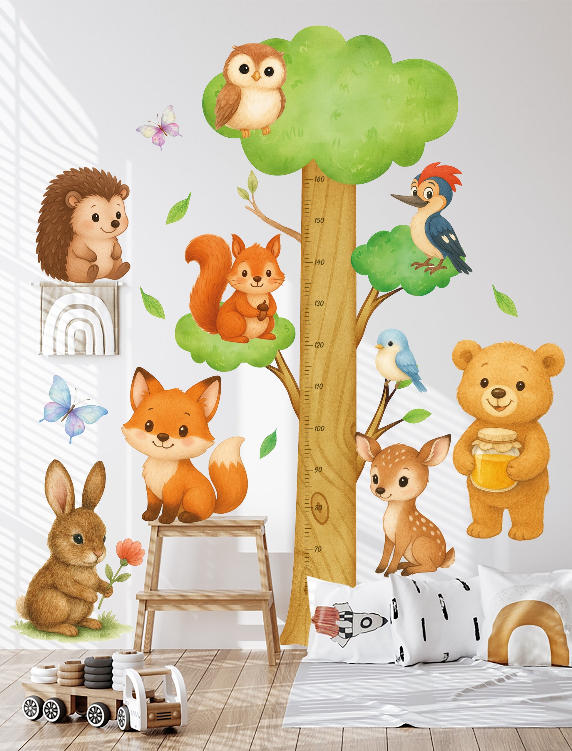 🌿 Sulu Boya Orman Dostları – Boy Ölçerli Çocuk Odası Duvar Sticker