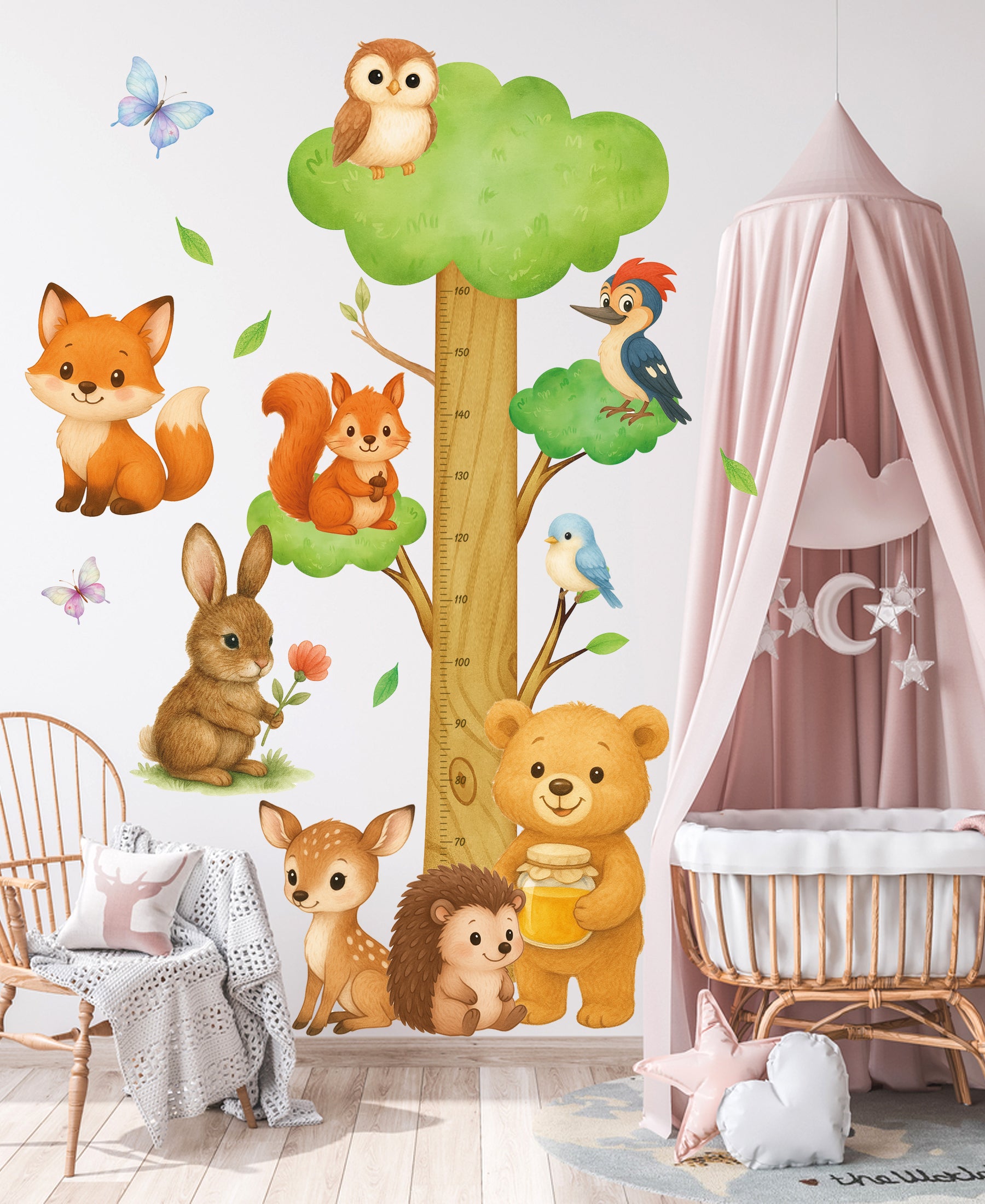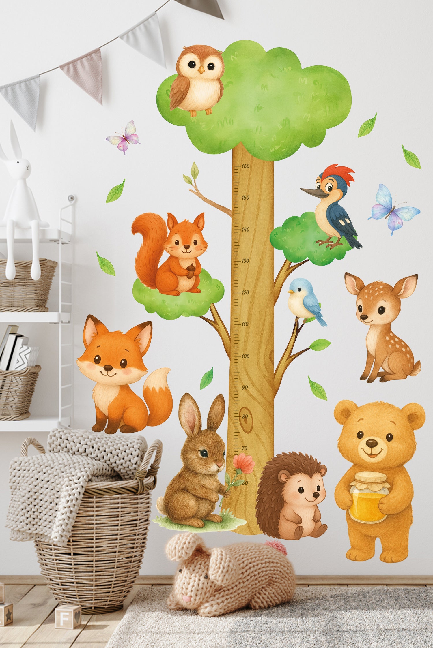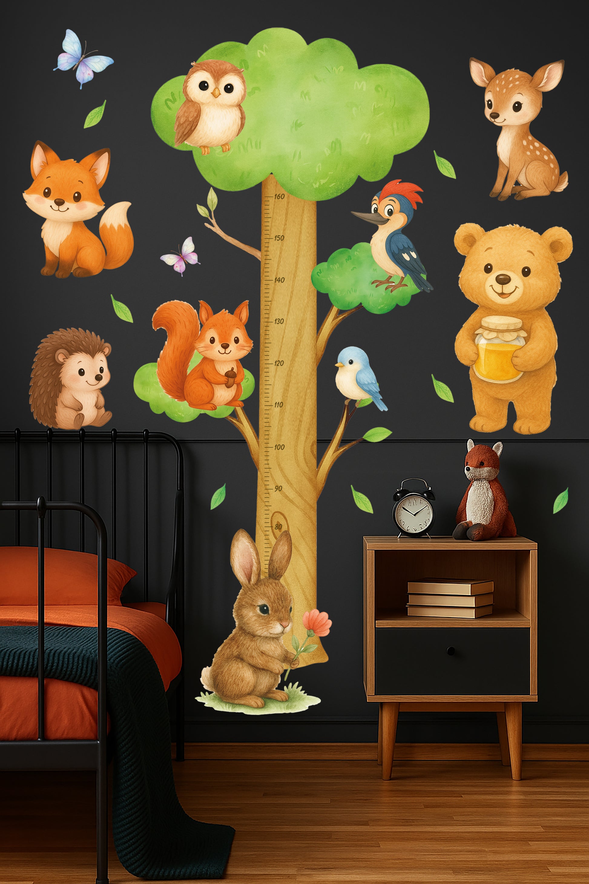 🌿 Sulu Boya Orman Dostları – Boy Ölçerli Çocuk Odası Duvar Sticker