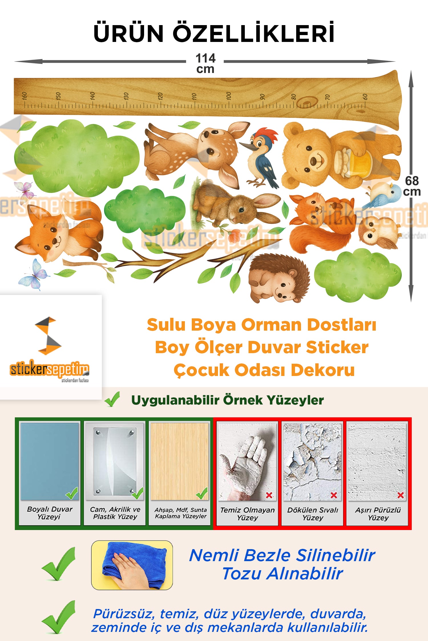 Sulu Boya Orman Dostları XL Boy Ölçer Duvar Sticker – Çocuk Odası Dekoru