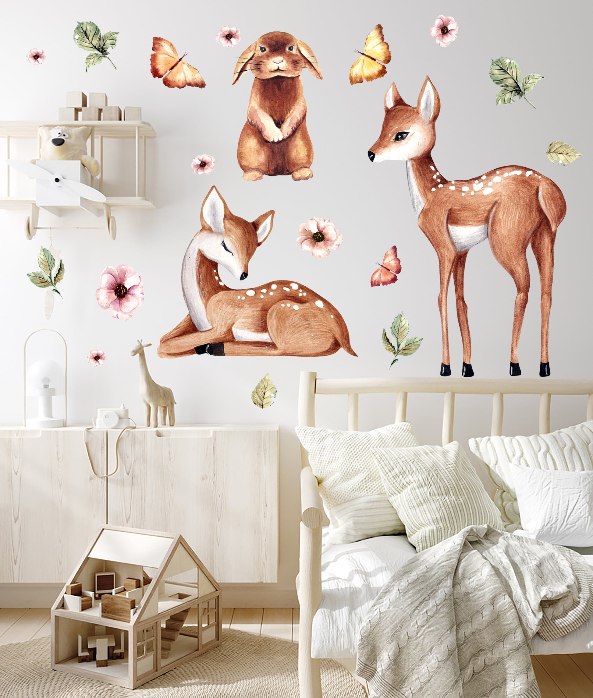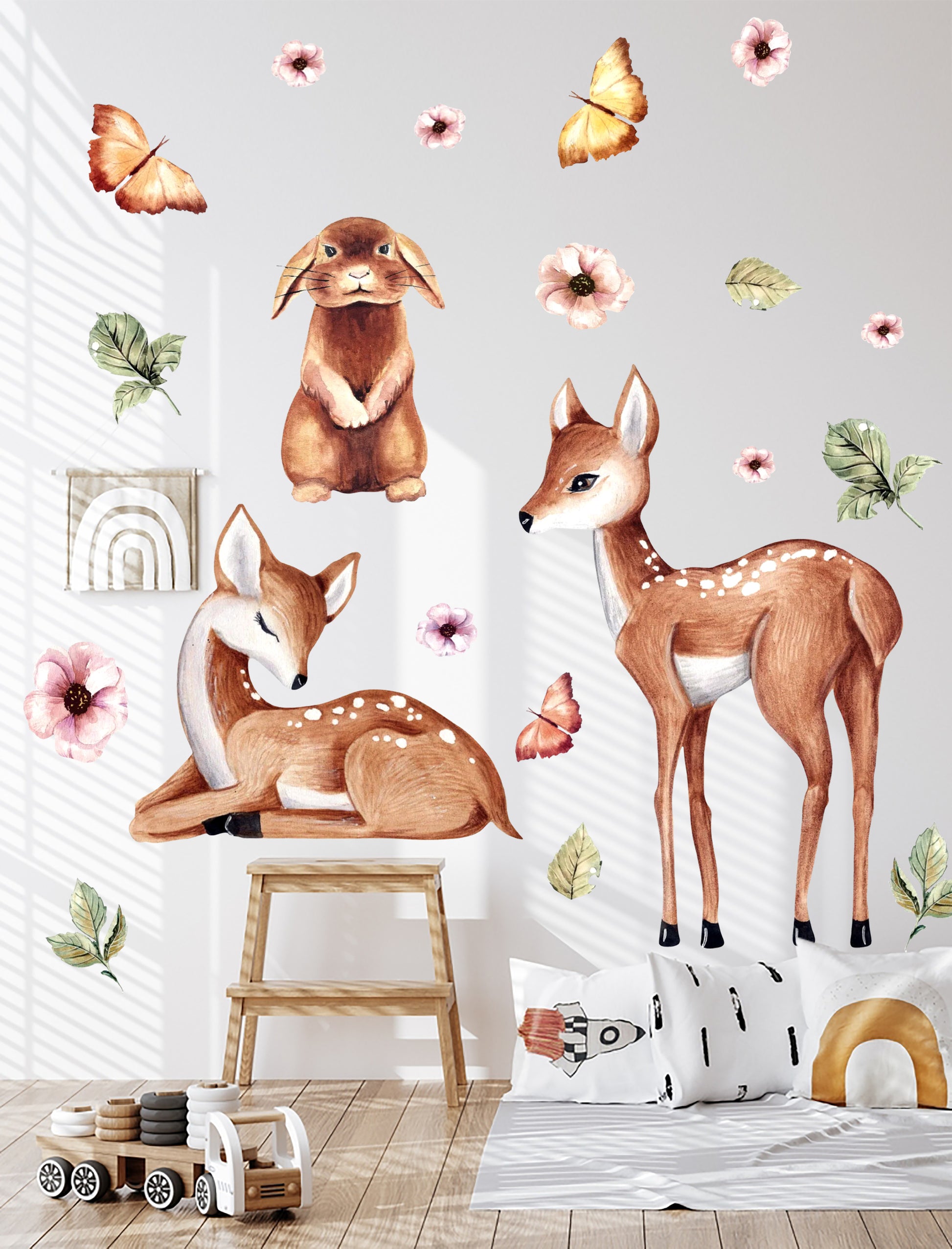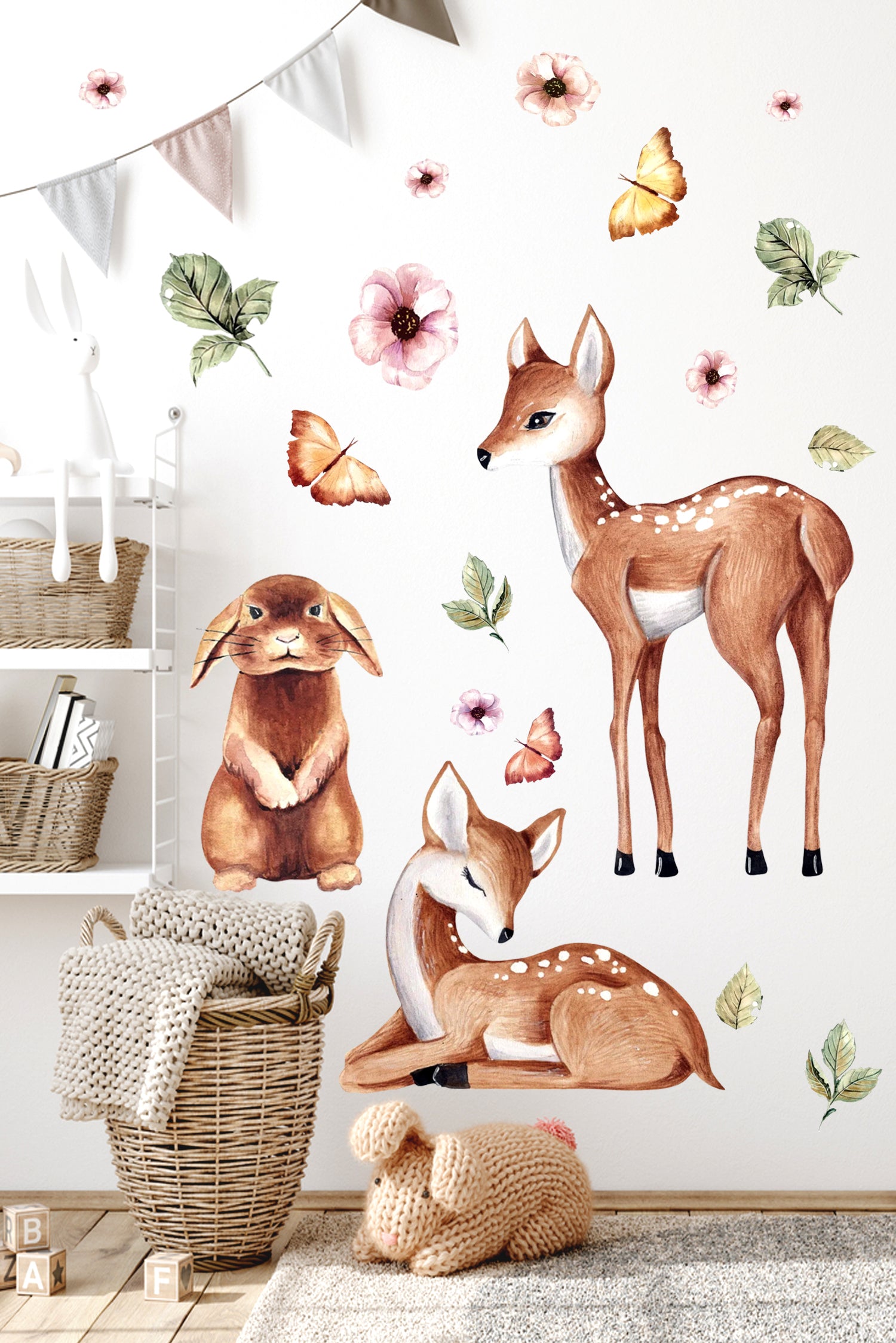 Sulu Boya Temalı Orman Dostları Sevimli Tavşan ve Yavru Ceylanlar Çocuk Odası Duvar Sticker